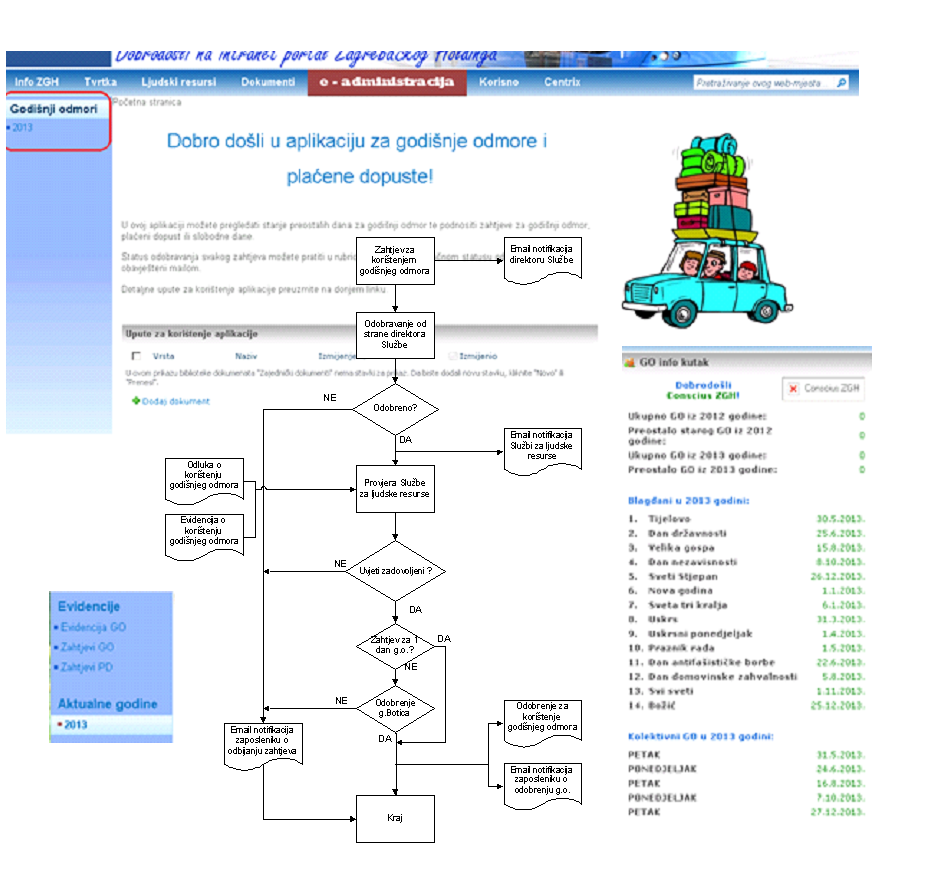 Rješenje predstavlja elektronički sustav za upravljanje godišnjim odmorima, slobodnim danima i plaćenim dopustima. Omogućuje predaju zahtjeva za godišnji odmor, slobodni dan ili plaćeni dopust, odobravanje odgovornih osoba, generiranje odgovarajućih dokumenata odobrenja i njihovo urudžbiranje. Rješenje je usklađeno s praznicima i vikendima, kolektivnim godišnjim odmorima te prati broj iskorištenih dana za svakog zaposlenika